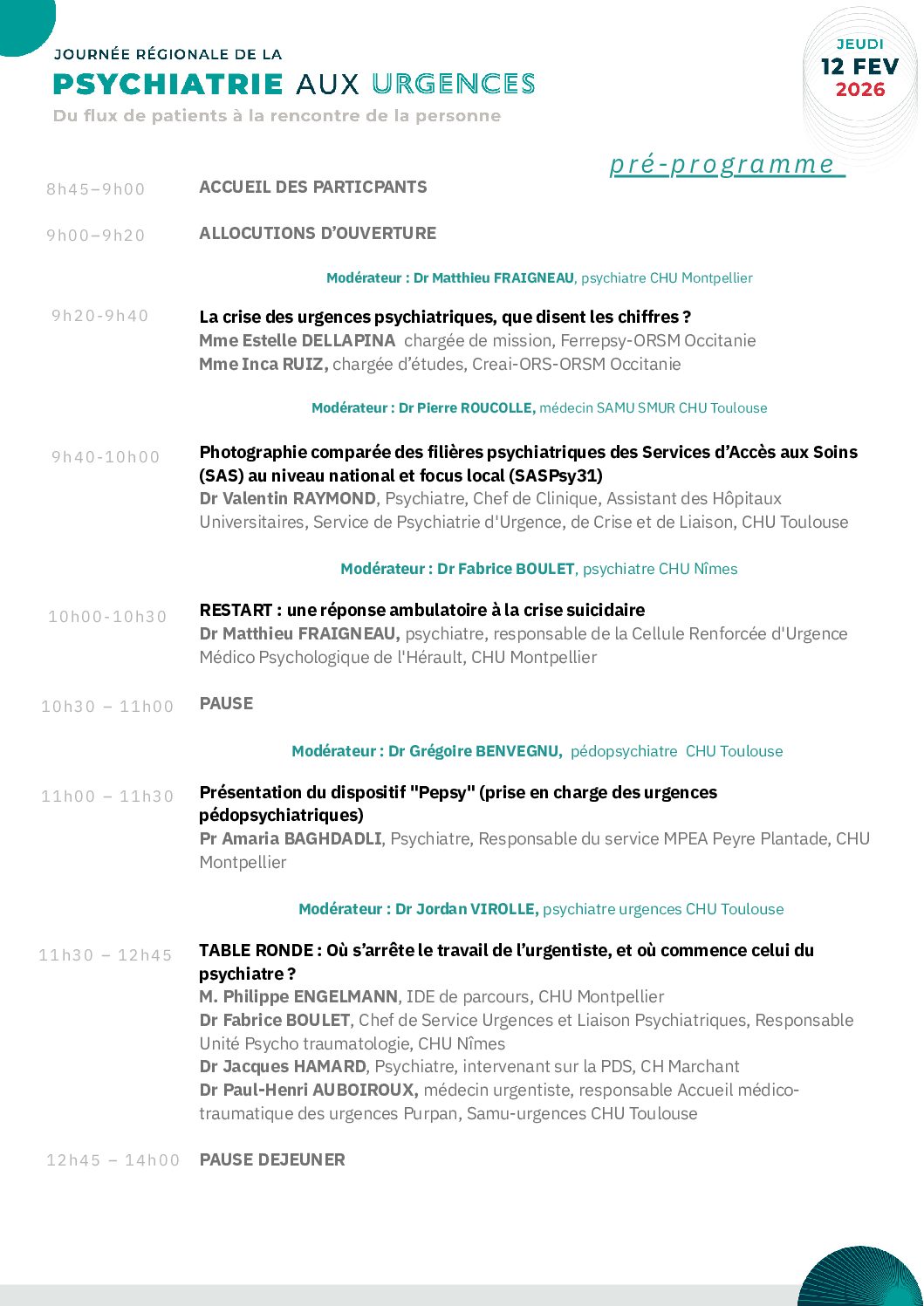 Au travers de ces thématiques, cette première rencontre sera l’occasion de faire le point sur la situation actuelle et les enjeux à venir, de discuter des dispositifs innovants déjà existants ou en cours d’élaboration, et de réfléchir ensemble à une psychiatrie d’urgence plus lisible, plus coordonnée, plus humaine. Pour que nos organisations et nos pratiques du soin nous permettent de ne plus craindre d’être engloutis par le flux et nous autorisent à nouveau la rencontre soignante.